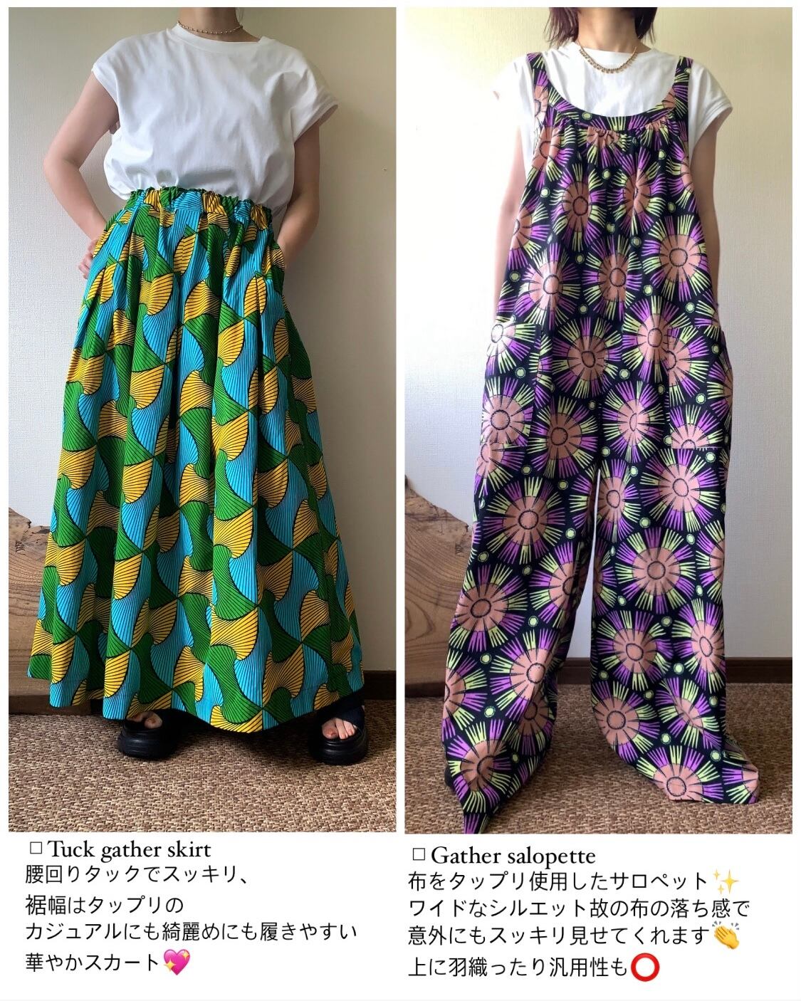 同じ柄布で、リラックスパンツ/ストレートパンツに変更も可能です。スカートも可能ですが柄の向きが逆向きになります。