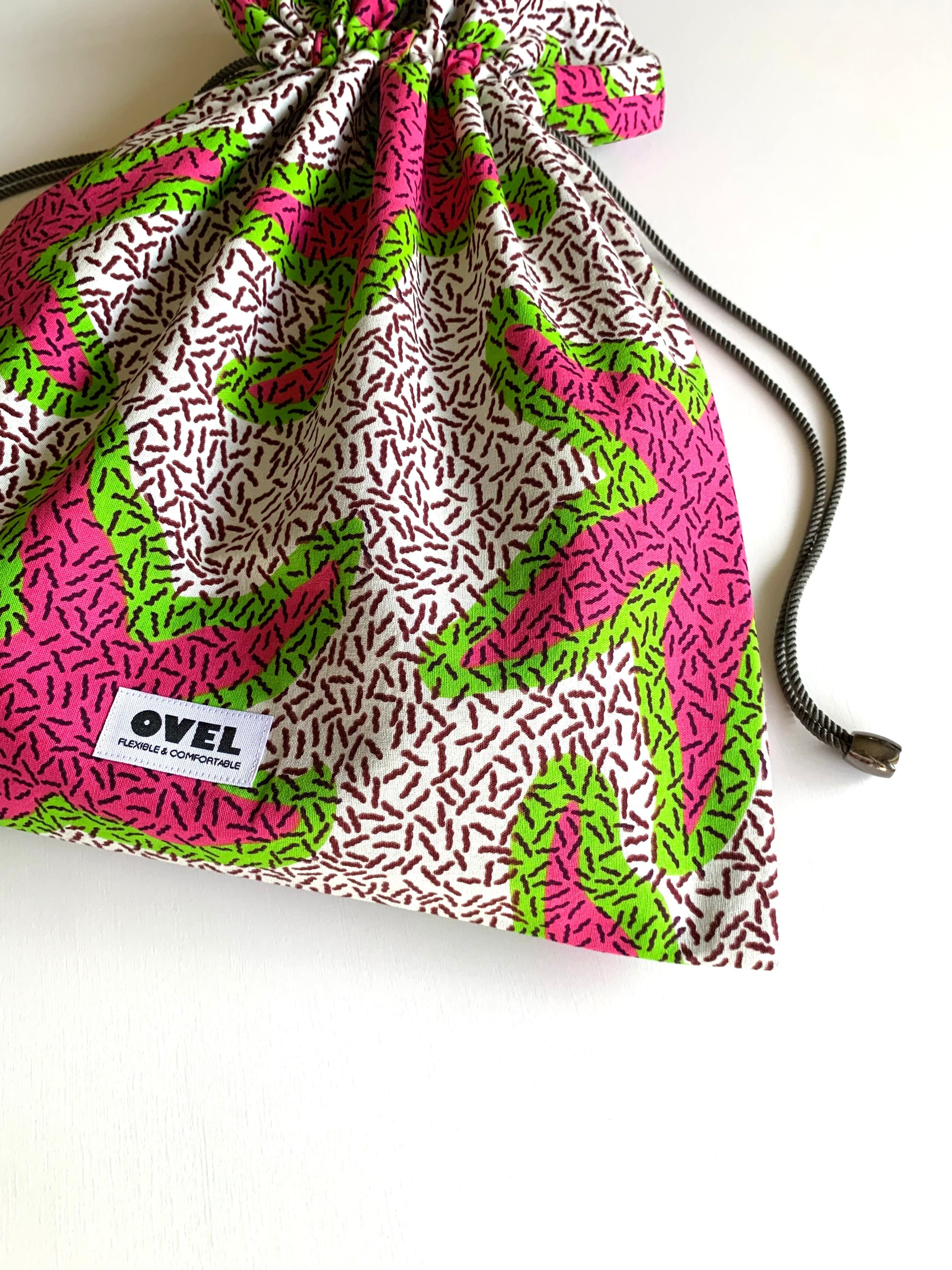 個性溢れるアフリカ布達の個性引き立つ、シンプルな巾着型のバッグに仕立てました。