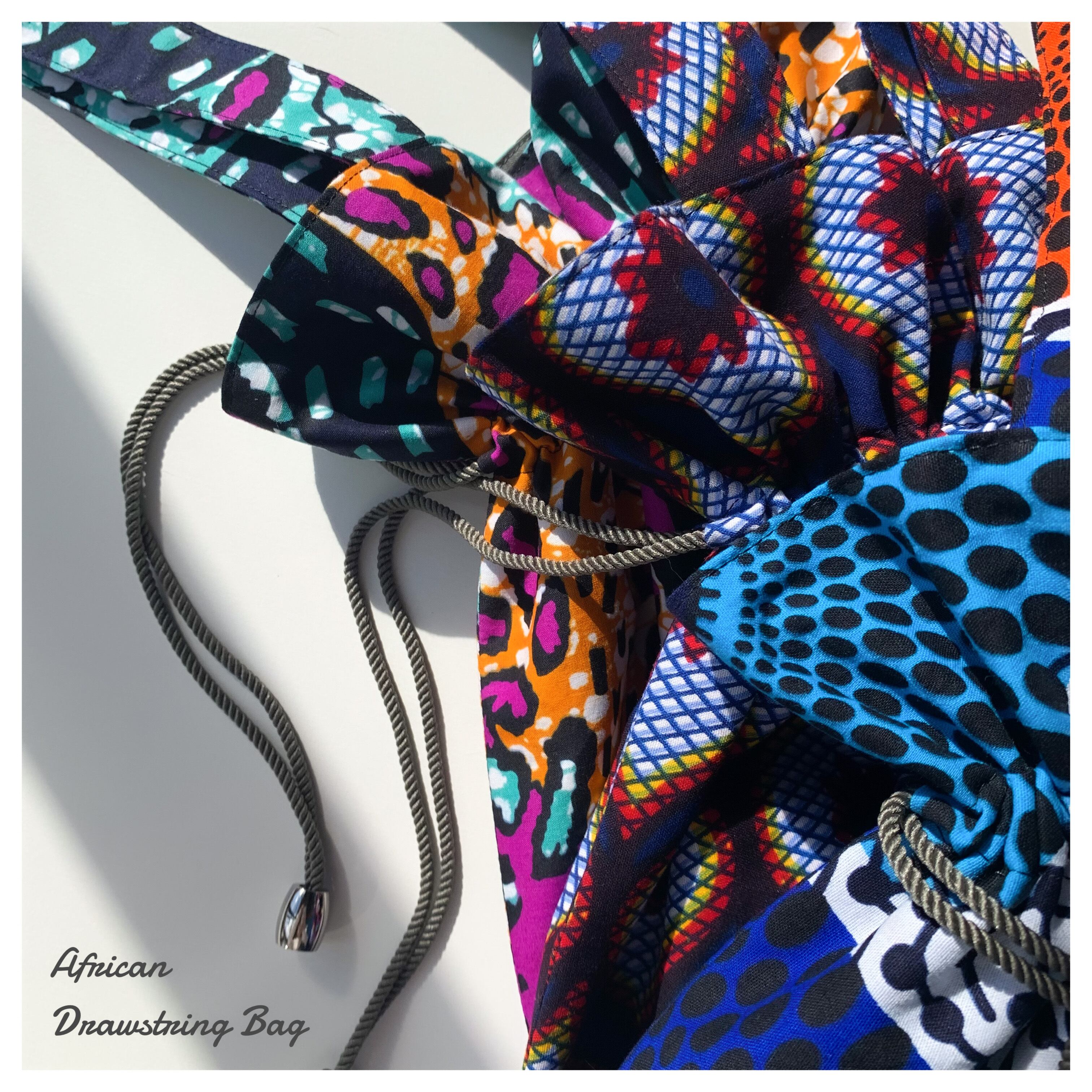 個性溢れるアフリカ布達の個性引き立つ、シンプルな巾着型のバッグに仕立てました。