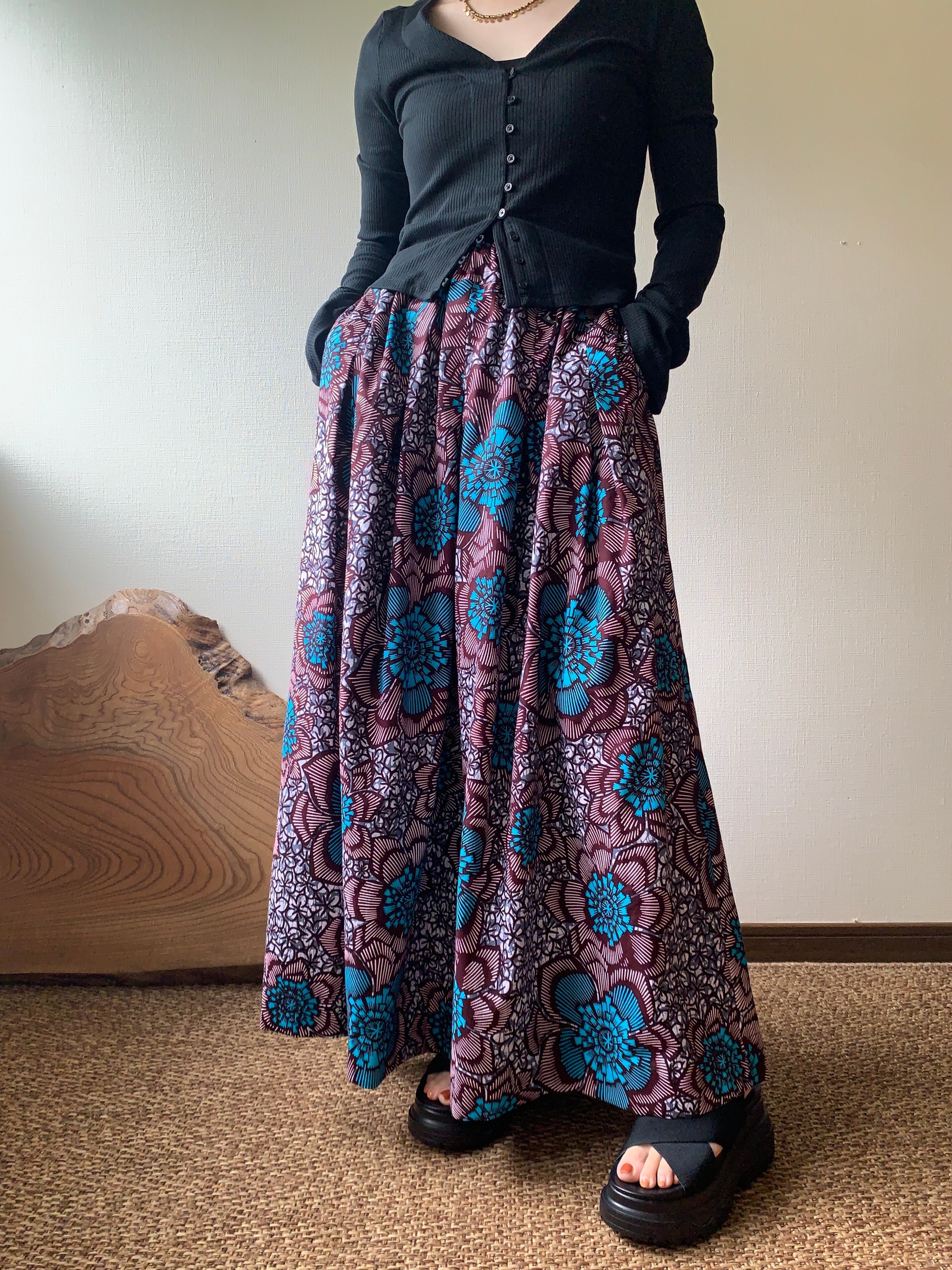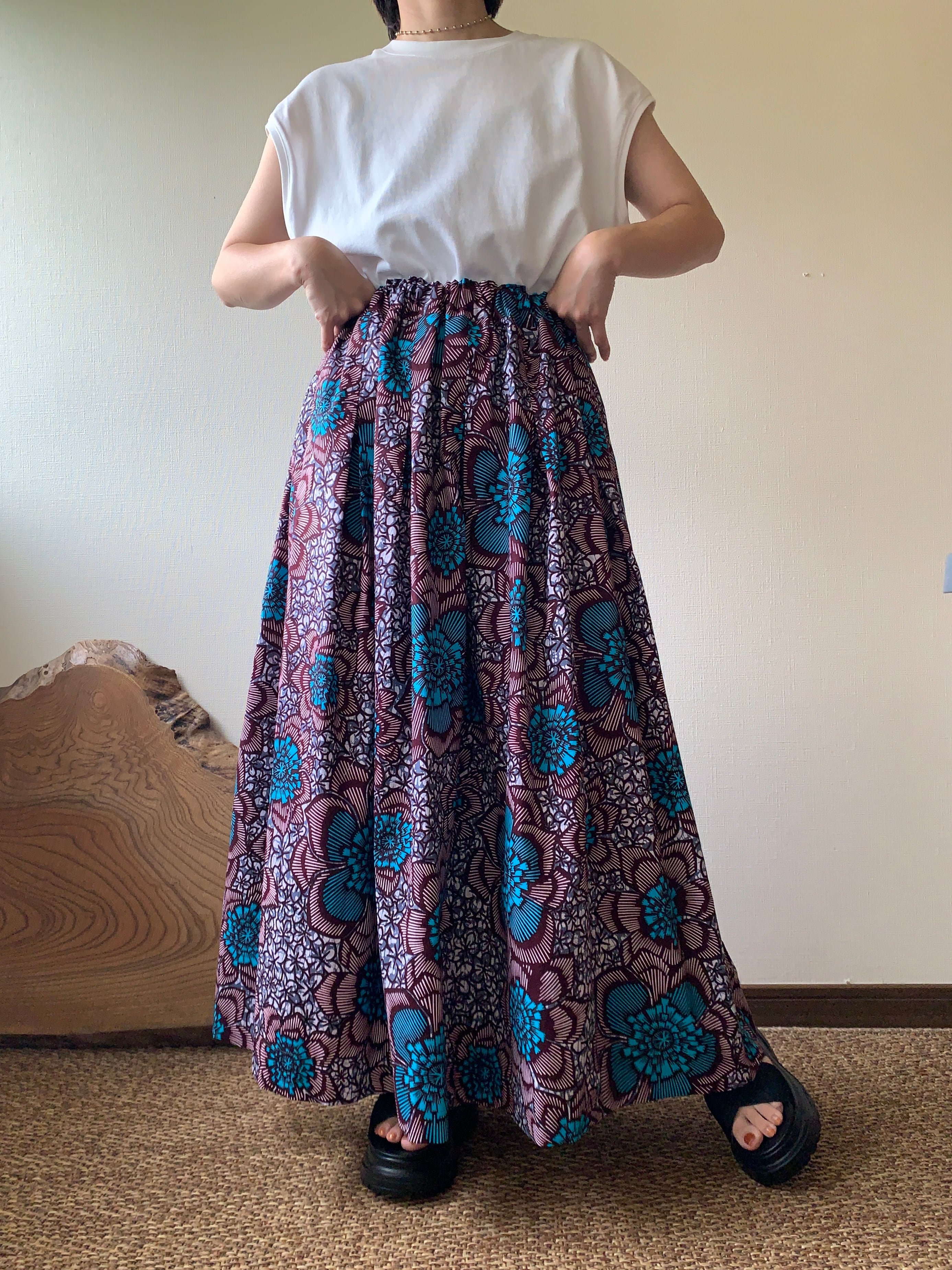 【受注製作】tuck gather skirt ≪brn/turquoise flower≫アフリカンスカート アフリカ布 アフリカンファブリック アフリカンプリント