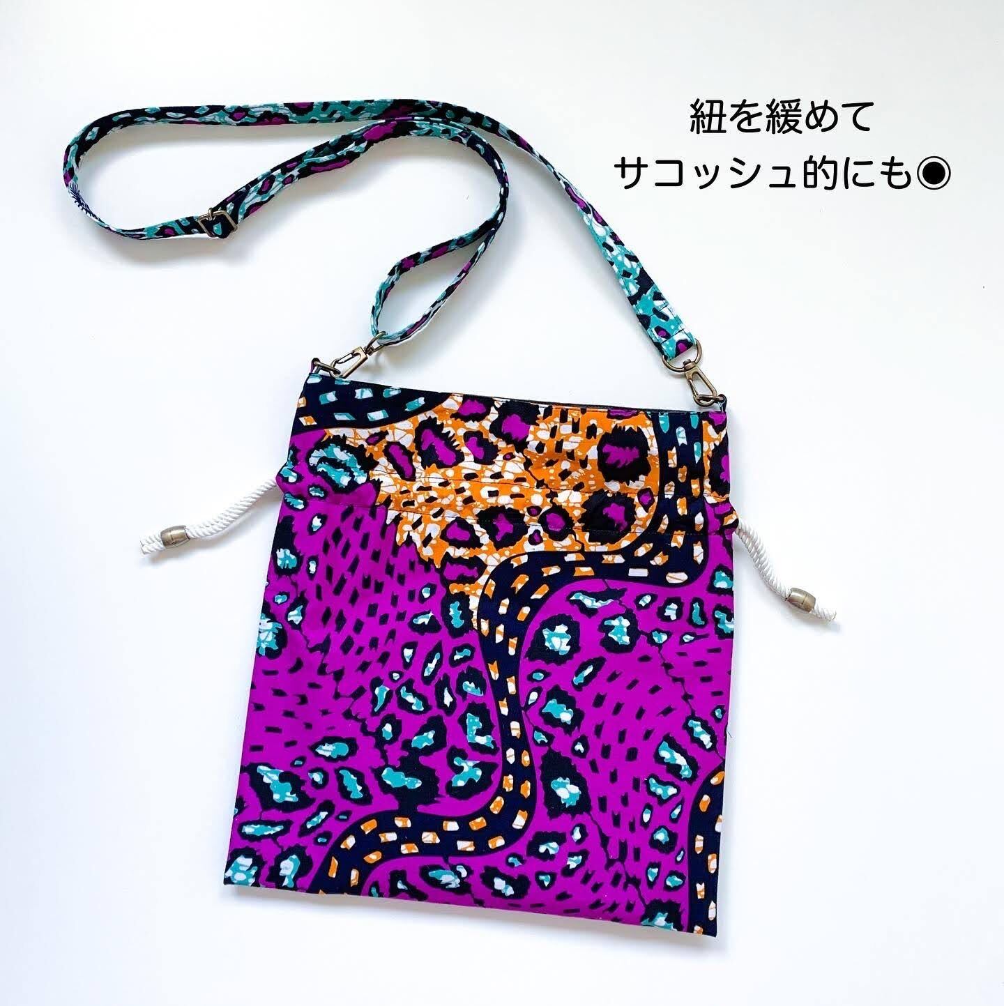 【受】Kinchaku sacoche ≪Sunshine≫ アフリカンプリント アフリカ布 アフリカンファブリック アフリカンバティック 巾着バッグ 巾着ショルダー